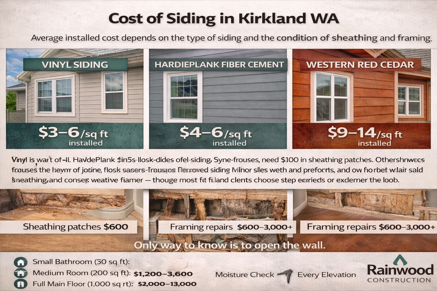 No honest flat rate. Square footage, material, hidden rot, trim complexity — all move the number. Kirkland homes near the lake tend to have more moisture damage than inland builds, which affects structural repair scope. In-person estimate with a line-item breakdown before anything starts.