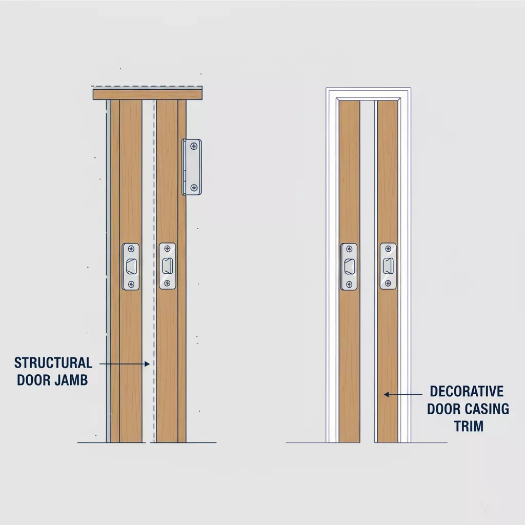 The door frame (or jamb) is the structural box the door sits in — head jamb across the top, two side jambs, and a threshold at the bottom. Door frame casing is the decorative trim applied over the joint where that frame meets the wall. Think of it this way: the frame holds the door, the casing covers the frame’s edges. They’re separate components, though most people use the terms interchangeably until something breaks.