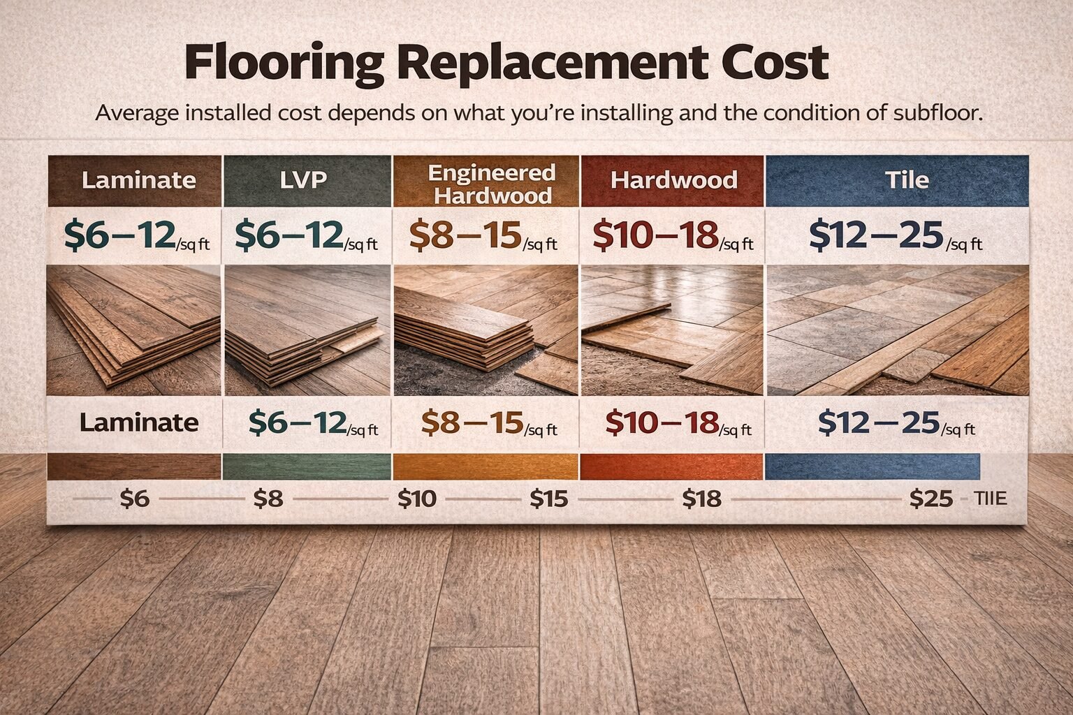 Flooring replacement cost depends on three things: what you’re removing, what’s going down, and what the subfloor needs. LVP or laminate runs $6–12/sq ft installed. Hardwood: $10–18. Tile: $12–25. Engineered hardwood sits in between at $8–15. Material is part of it. Demo, subfloor repair, and transitions are the rest.