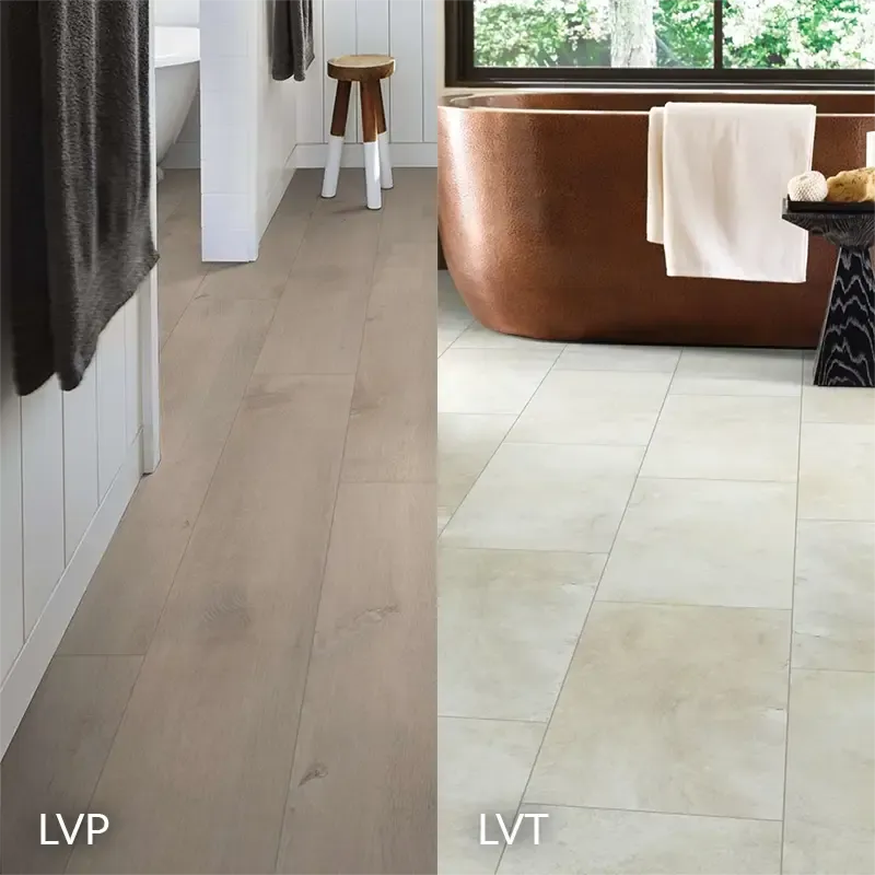 Format. LVT comes in square or rectangular tile shapes — mimics stone or ceramic. LVP comes in plank shapes — mimics wood. Same core materials, same waterproof performance, same subfloor requirements. Layout and joint patterns differ. We install both.