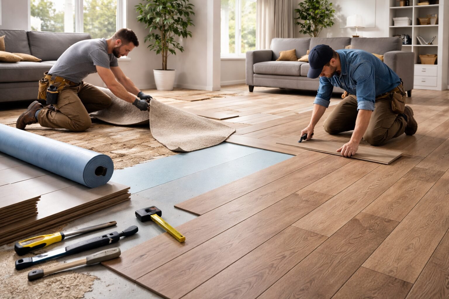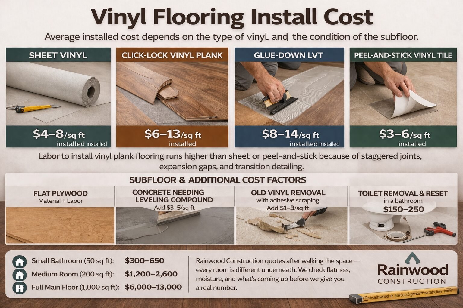 Subfloor condition drives the rest. Flat plywood: material + labor. Concrete needing leveling compound: add $3–5/sq ft. Old vinyl removal with adhesive scraping: add $1–3/sq ft. Toilet removal and reset in a bathroom: $150–250. Rainwood Construction quotes after walking the space — every room is different underneath.