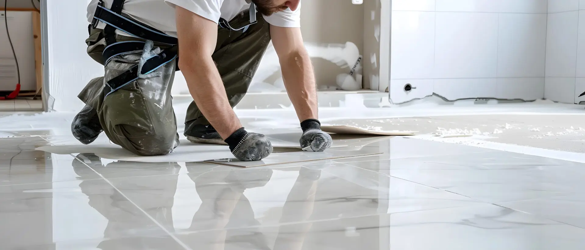 Standard bathroom floor: 3–4 working days. Kitchen or living area in large-format: 5–8 days. Large-format porcelain sets slower — back-buttering, leveling clips, and two-person handling on every piece. We schedule cure time between substrate prep and tile, and between tile and grout. No rushing layers.